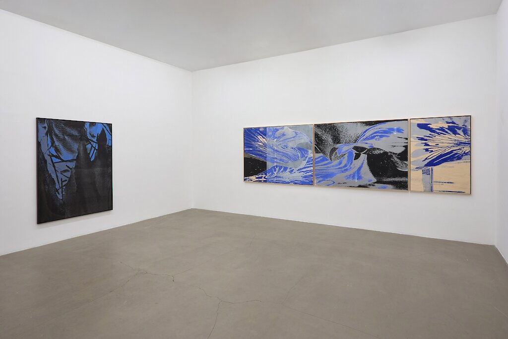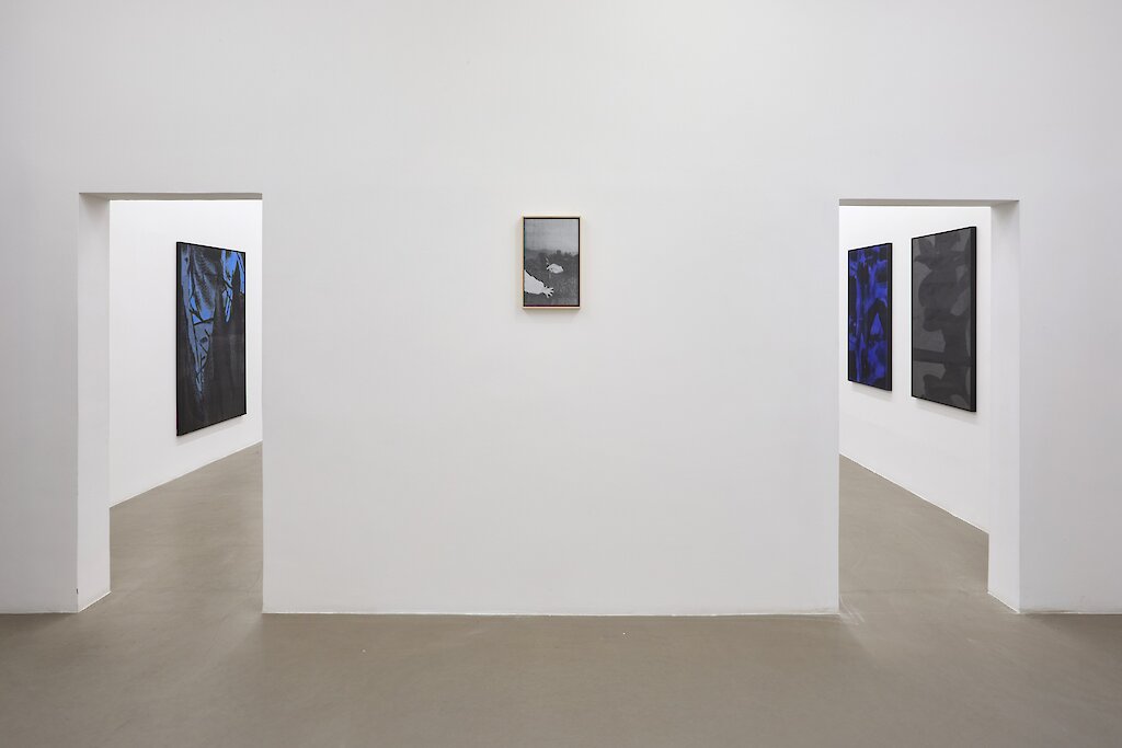 Le serigrafie di cui è composta la mostra Entre chien et loup sono malinconiche presenze-fantasma, misteriose e sfuggenti, stampate sul legno tramite vuoti, ombre, tracce, sovrapposizioni, sfocature, trasparenze, corpi incompleti. Sono la trasposizione del disorientamento della trasformazione in un processo che riflette il funzionamento della memoria, di cui l’oblio è parte integrante. Restituendo quell’istante fugace della giornata definita crepuscolo, l’artista ci conduce in un viaggio percettivo alla scoperta della nostra stessa visione. Ogni immagine si rivela come dettaglio, come traccia di ciò che la nostra fantasia proietta. Dalle sagome ancora riconoscibili, seppure mutate dalla luce blu del crepuscolo, a quelle via via più inquietanti che si definiscono con l’avanzare delle tenebre, ciò che inizialmente appariva rassicurante nella sua leggibilità si dissolve lentamente, scivolando fino a occupare un posto nelle stratificazioni più profonde del nostro pensiero. Lo sguardo sospeso indugia su ciò che non esiste più senza tuttavia riuscire a trattenerlo del tutto. Non più addomesticato dalla nostra conoscenza, esso è mutato in altro, diventato selvatico. Dopo un primo ingresso nella dimensione della transizione ambivalente e indefinita, al confine tra il noto e l’ignoto, con il passare del tempo emergono metaforicamente le ombre scure e inafferrabili del “lupo”, simbolo dell’incontrollabile, dell’imprevedibile, dell’indomabile che suscita timore. Cristallizzato dalle immagini prodotte dall’artista, quel momento sospeso della giornata — segnato da luci fievoli, ombre sfumate e una graduale indistinzione tra la memoria inconscia e ancestrale – apre un intervallo in cui la percezione diventa più sensibile, sfumata, nel quale l’anima si rende propensa ad accogliere i ricordi, perduti, ambigui, sfuggenti.
